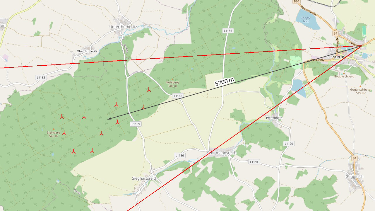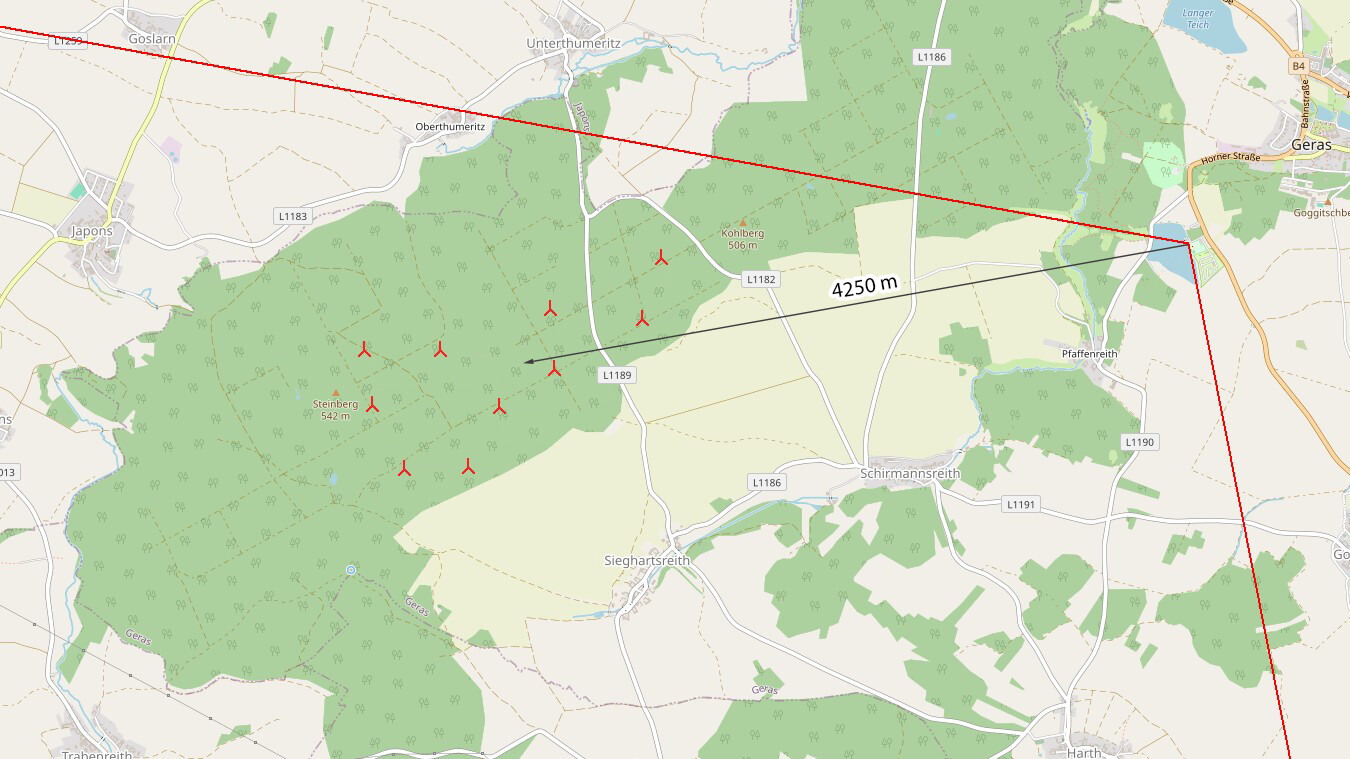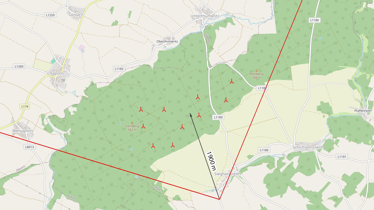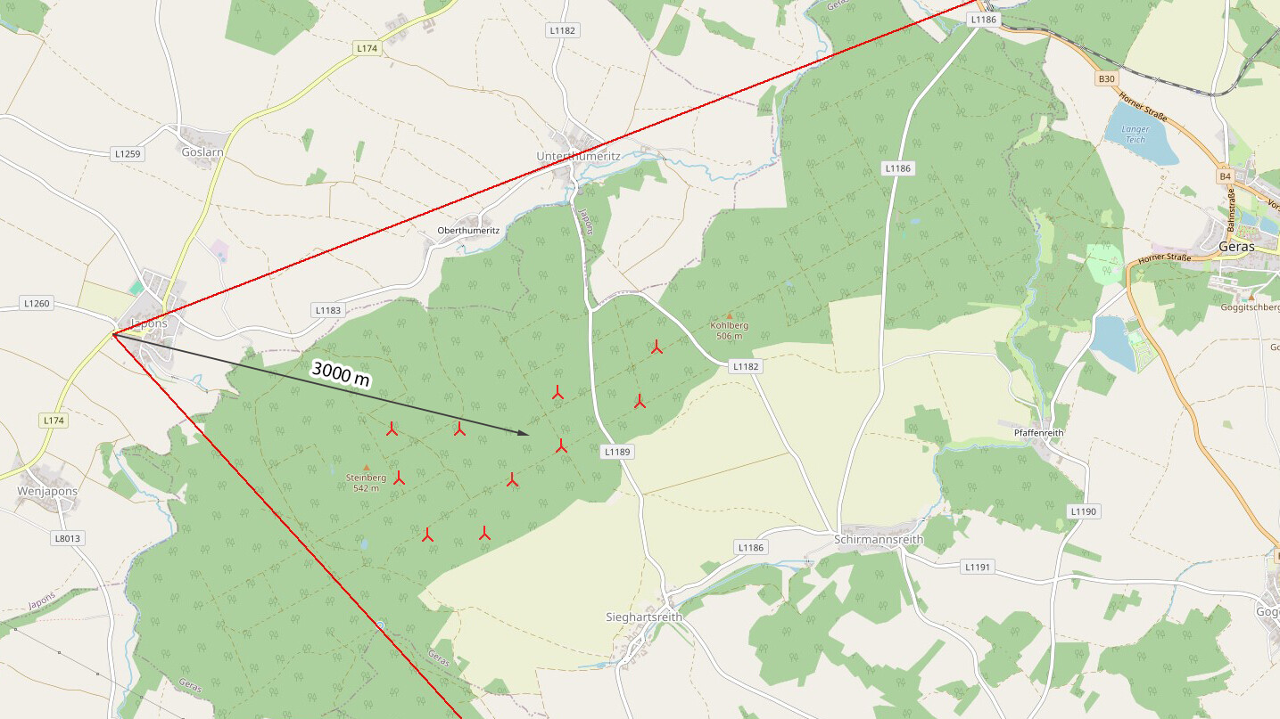 - Auf den folgenden Bildern sind die Entfernungen zu den geplanten Windkraftanlagen sowie der Blickwinkel der oben präsentierten Visualisierungen dargestellt.