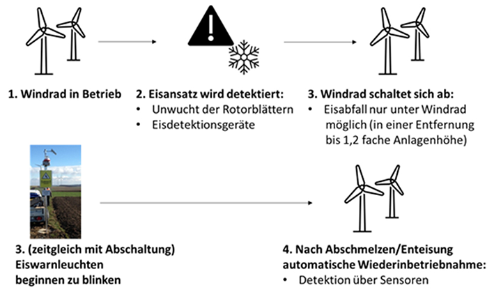 Moderne Windkraftanlagen sind mit Technologien ausgestattet, die das Risiko von Eisabfall minimieren:
